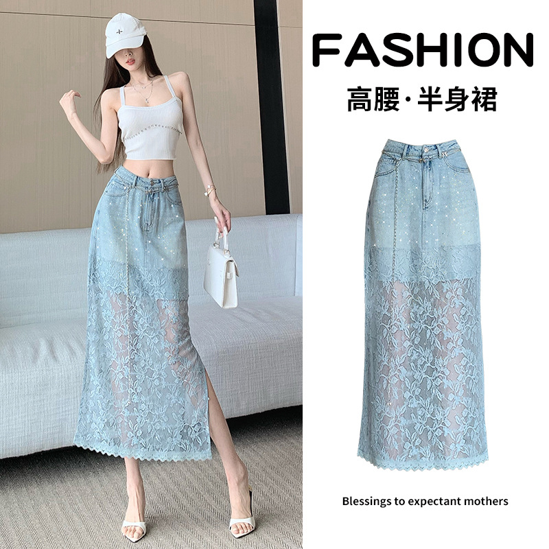 Gula ~ Rok A-Line Terlihat Langsing Pinggang Tinggi Ukuran Besar Modis Model Baru Musim Panas Wanita Rok Setengah Badan Kombinasi Renda Denim