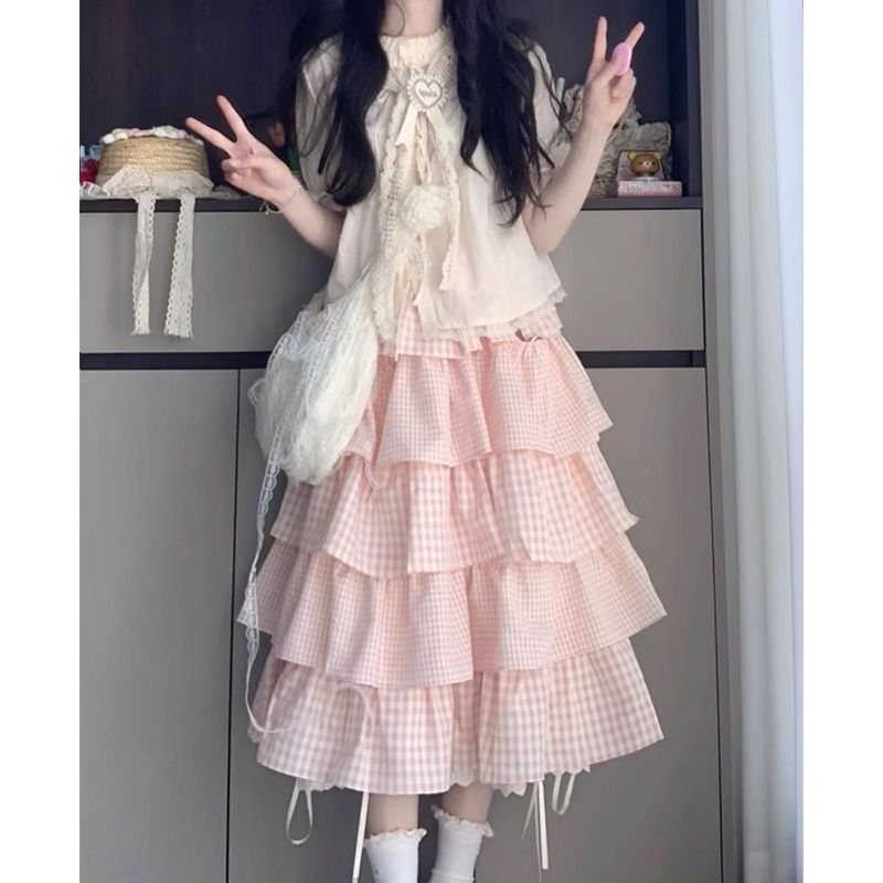 Rok Setengah Badan Kecil Kotak-kotak Pinggang Bunga Warna Merah Muda Lembut Ukuran Besar Rok Kue Manis Pinggang Tinggi Model Baru Musim Panas 2025 Terlihat Langsing