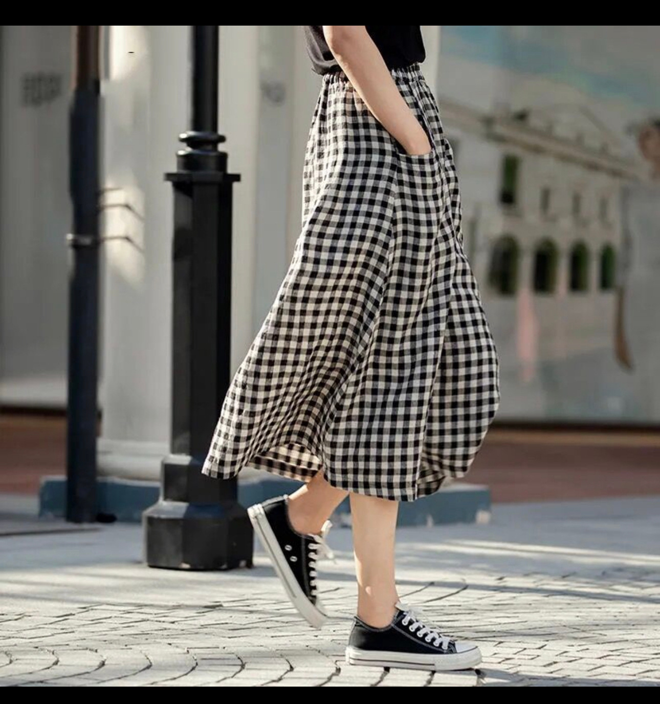 Rok katun linen gaya Korea, rok kotak-kotak kecil setengah panjang, rok panjang a-line tipis musim panas dan semi
