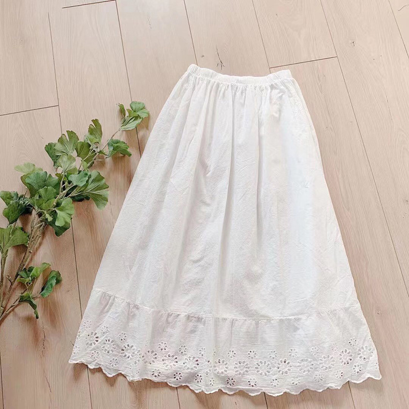 Rok bawahan longgar linen wanita, bawahan katun renda berlubang segar gaya jepang musim panas