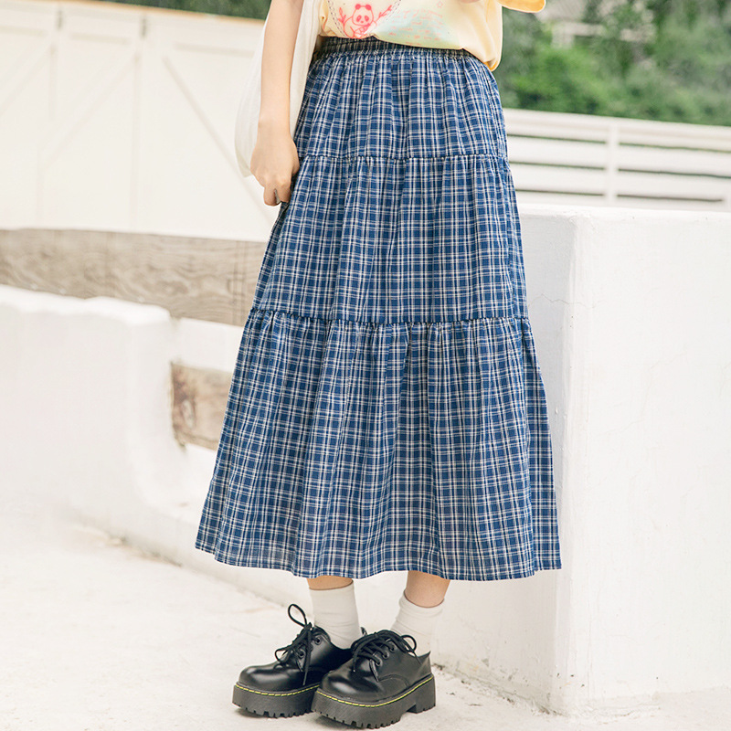 Rok Kue Kotak-kotak Kombinasi Pinggang Elastis Gaya Jepang Rok Setengah Badan Rok Panjang A-Line Elegan Terlihat Kurus Longgar Musim Panas Wanita