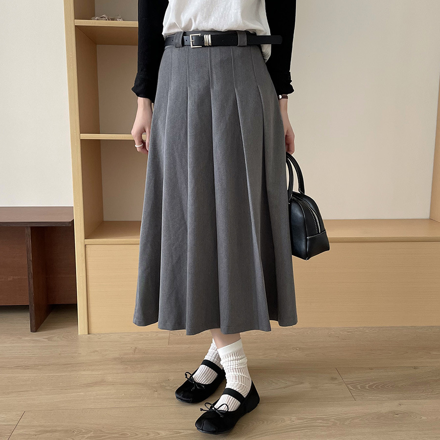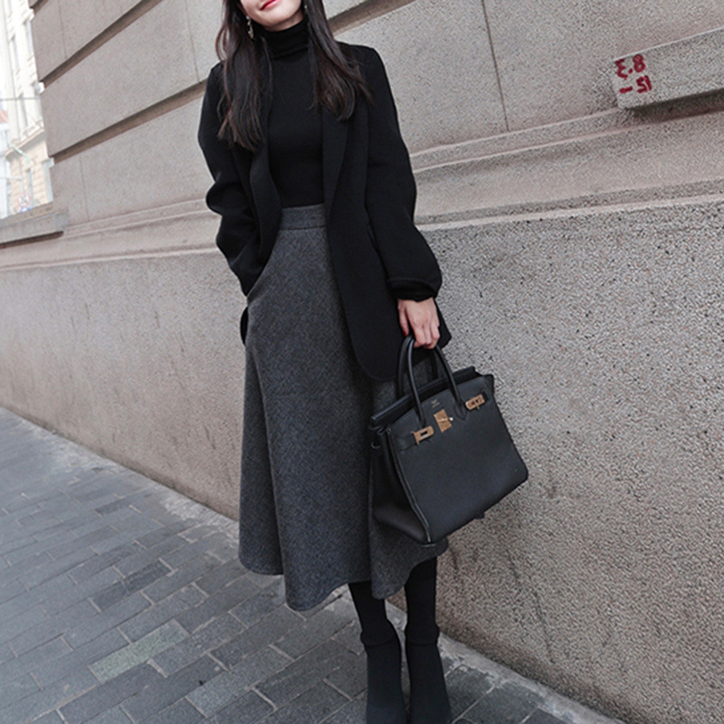 Rok wol longgar gaya Korea wanita, Rok lipit a-line pinggang elastis musim gugur dan musim dingin
