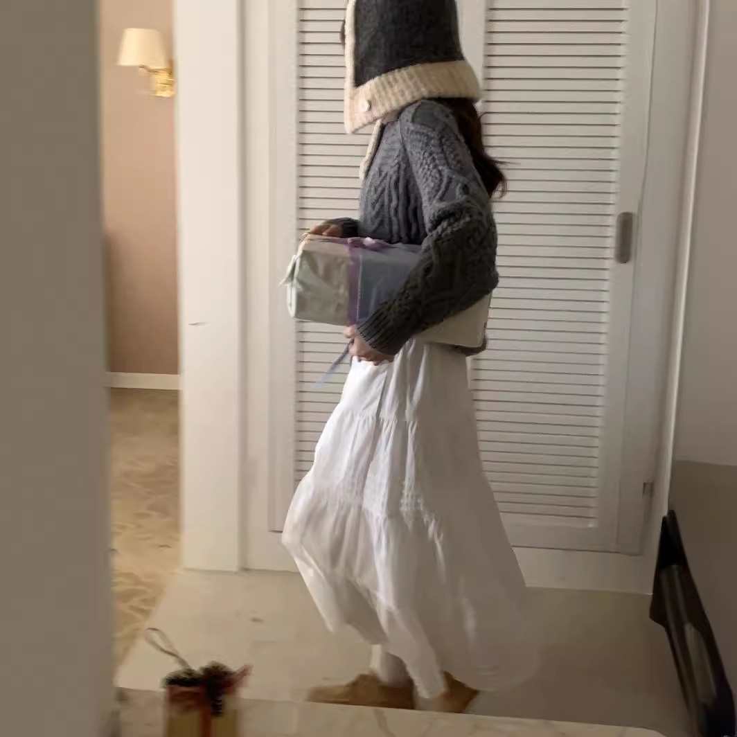Gaun wol ramping wanita, rok abu-abu musim gugur dan musim dingin baru pinggang tinggi elegan kelas atas longgar 2023