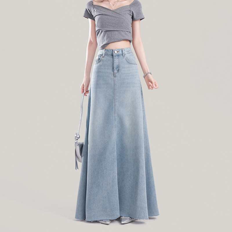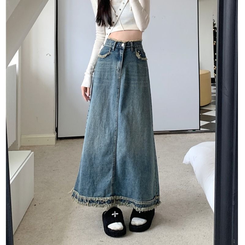 Rok Panjang Setengah Badan Denim Pinggir Wol Versi Korea Mudah Dipadu Padan Gaya Desain 2508 Rok Panjang Setengah Panjang Denim Longgar Musim Semi Musim Gugur Pinggang Tinggi Wanita