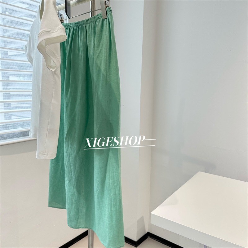 Rok midi katun dan linen longgar untuk wanita, Rok midi lurus terbelah kelas tinggi longgar pinggang elastis baru musim panas
