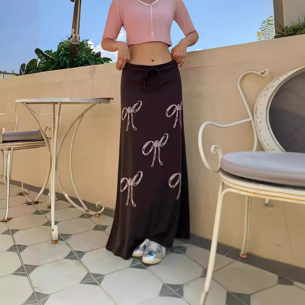 Gaun lurus longgar ikat tali serut wanita, rok pelangsing motif pita warna kontras retro Eropa dan Amerika 2024