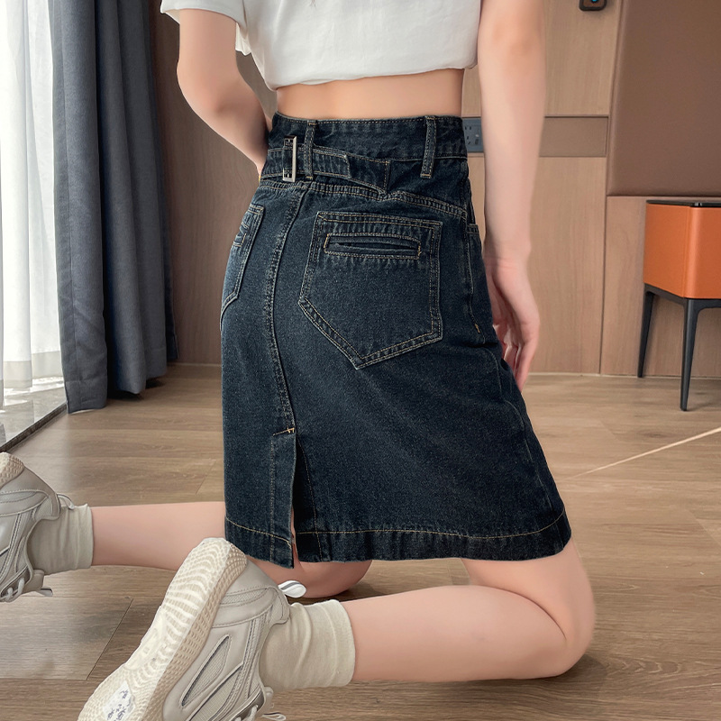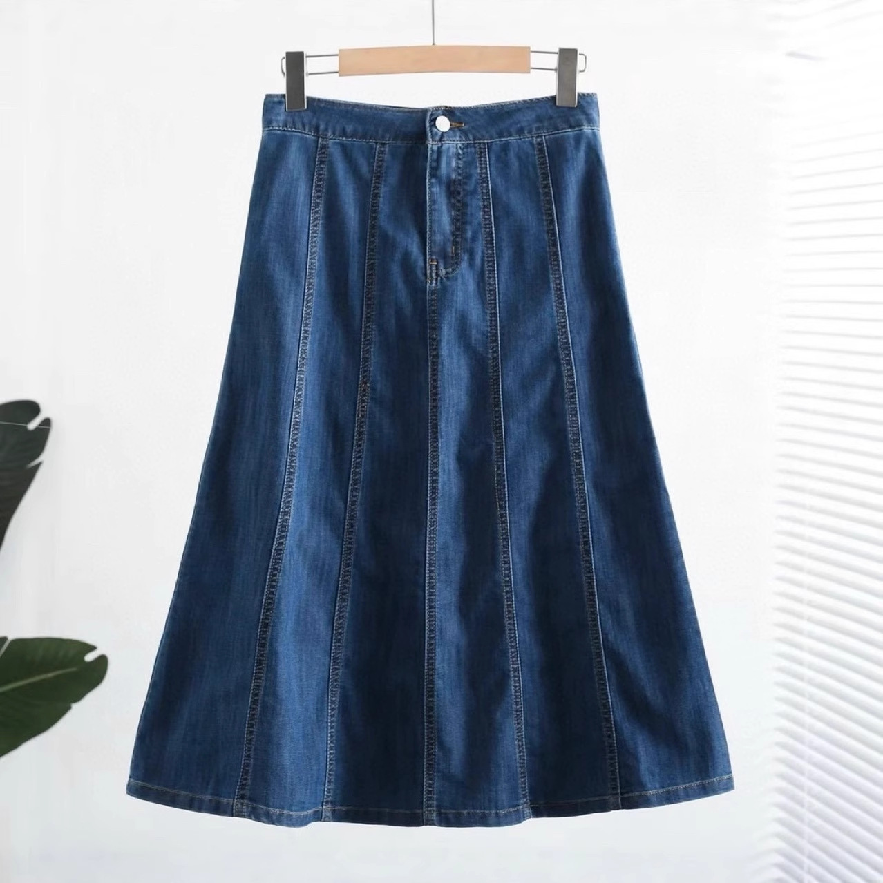 Rok Panjang Denim Model Baru Gaya Korea Rok Denim Pinggang Tinggi Ukuran Besar Wanita Rok Denim Pinggang Tinggi Terlihat Kurus di Bawah Lutut