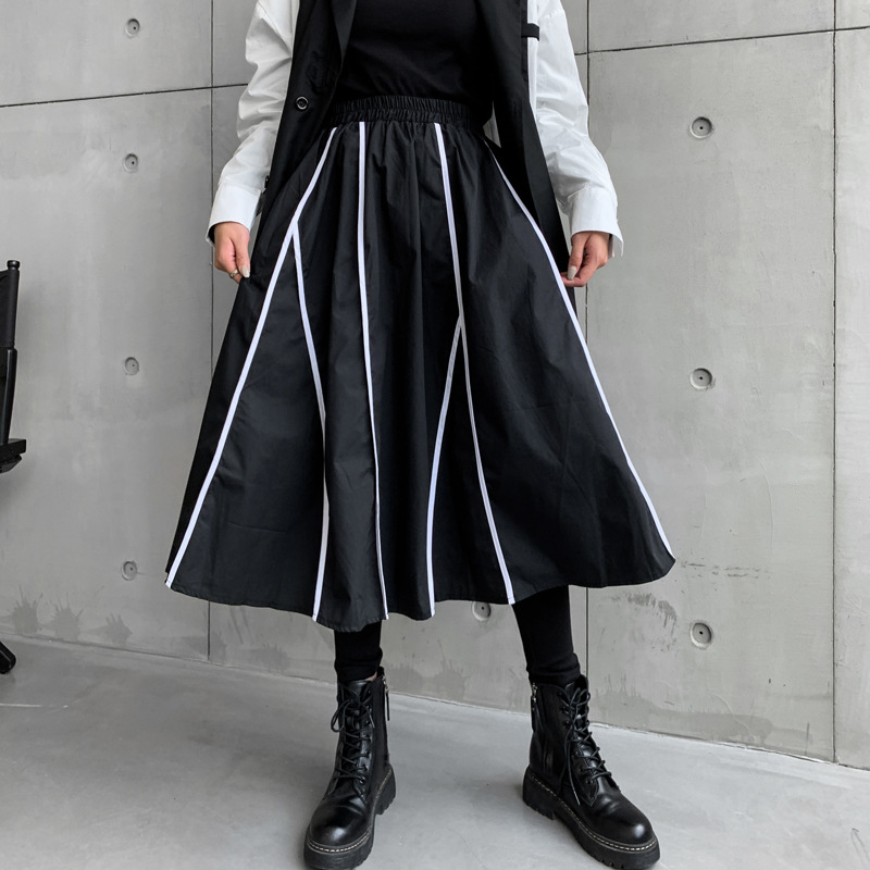 Rok gaya Hong Kong baru musim semi dan musim gugur 2024 rok midi tidak beraturan bergaris pinggang tinggi kasual rok a-line wanita ukuran besar