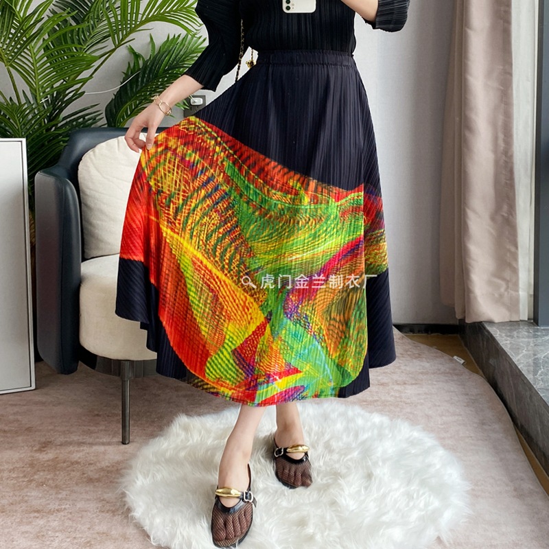 Miyake Gaya Lipit Musim Semi Musim Panas Neo-Barat Cetak Rok Setengah Badan Ibu Setengah Baya Ukuran Besar Modis Terlihat Kurus