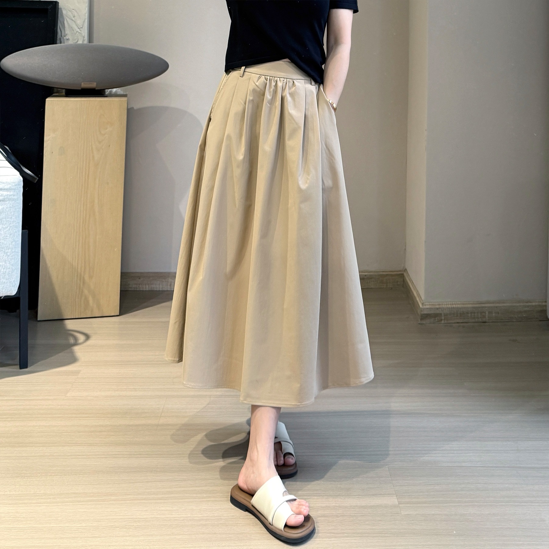 Rok wanita pinggang tinggi, rok model a-line tipis warna polos, penutup ukuran besar, rok ayun besar, musim panas