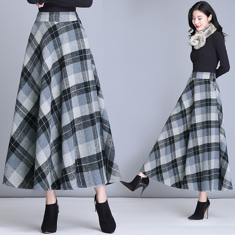 Real shot rok panjang wol wanita, rok panjang pinggang tinggi ukuran besar musim gugur dan musim dingin, rok a-line tebal payung ayunan besar