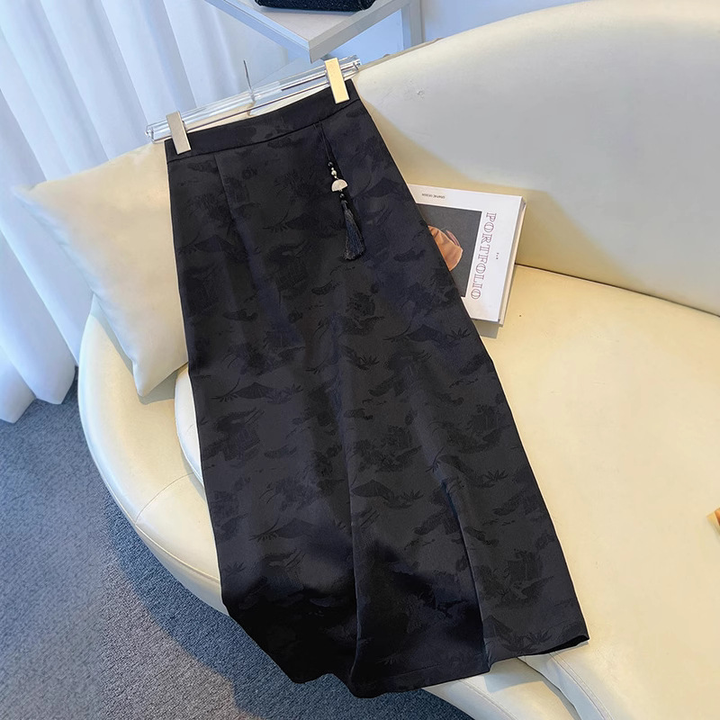Rok Setengah Badan Warna Hitam Gaya Tiongkok Baru Ukuran Besar Rok Wanita Musim Panas Wanita Gemuk Satin Asam Asetat Permukaan Lurus Berkelas