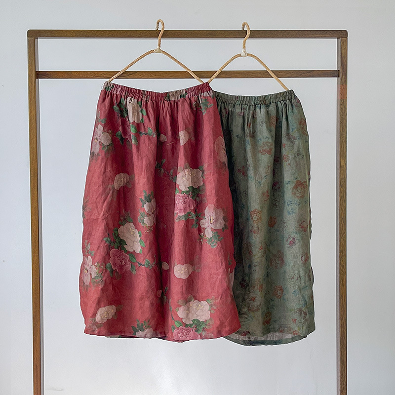 Manik-manik air/kualitas tinggi retro dicetak rok linen tanaman bunga ukuran besar katun linen rok longgar