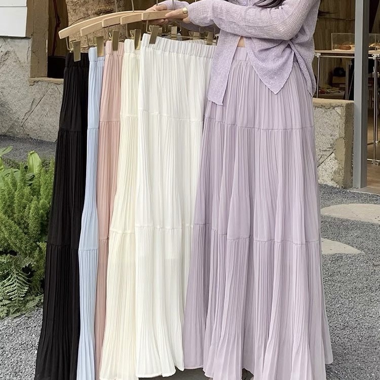 Rok Lipit Gaya Korea Rok Setengah Badan Terlihat Langsing Pinggang Tinggi Sifon Temperamen Musim Panas Wanita Rok Panjang A-Line dengan Ayunan Besar Longgar