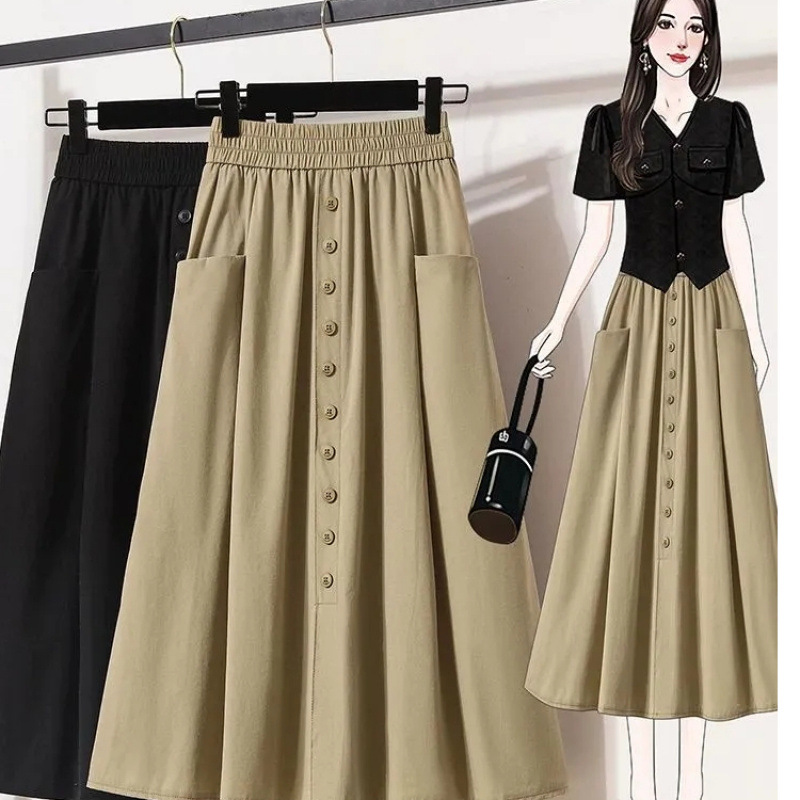 Rok Setengah Badan Pakaian Kerja Wanita Saku Terlihat Langsing Pinggang Tinggi Ukuran Besar Model Baru Versi Korea Musim Semi Musim Panas 2025 Rok Panjang Sedang Lebar Mudah Dipadu Padan