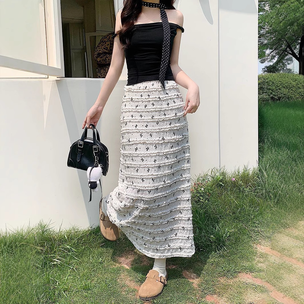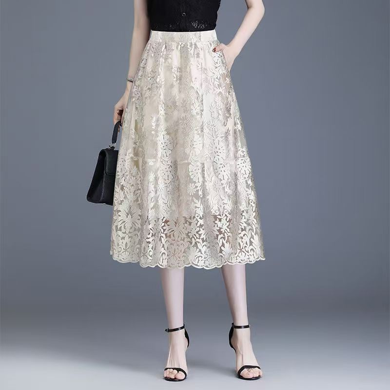 D6C Rok Benang Setengah Badan Bordir Pinggang Tinggi Rok Setengah Renda A-Line Model Baru Musim Panas 2025 Ukuran Besar Wanita Gemuk Model Panjang Sedang Lentera