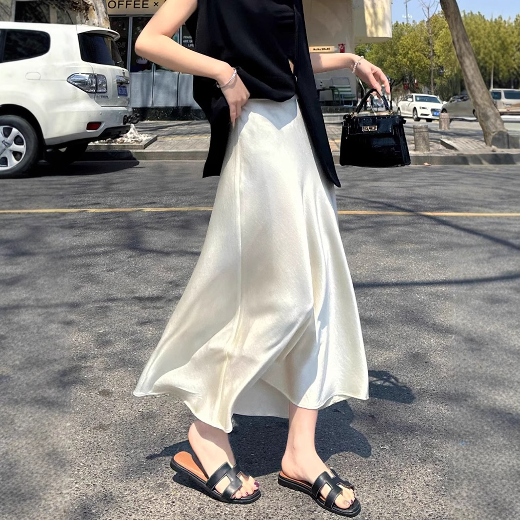 Rok Setengah Badan Asam Asetat Warna Putih Rok Ekor Ikan Satin Teritari Terlihat Kurus A-Line Pinggang Tinggi Wanita Gemuk Ukuran Besar Ukuran Tipis Musim Panas Wanita