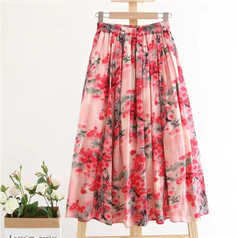 Rok Setengah Badan Bunga Kecil Retro Rok Wanita Musim Panas Ukuran Besar Rok Pinggang elastis Sifon Ukuran Besar Menutupi Pinggir Daun Teratai