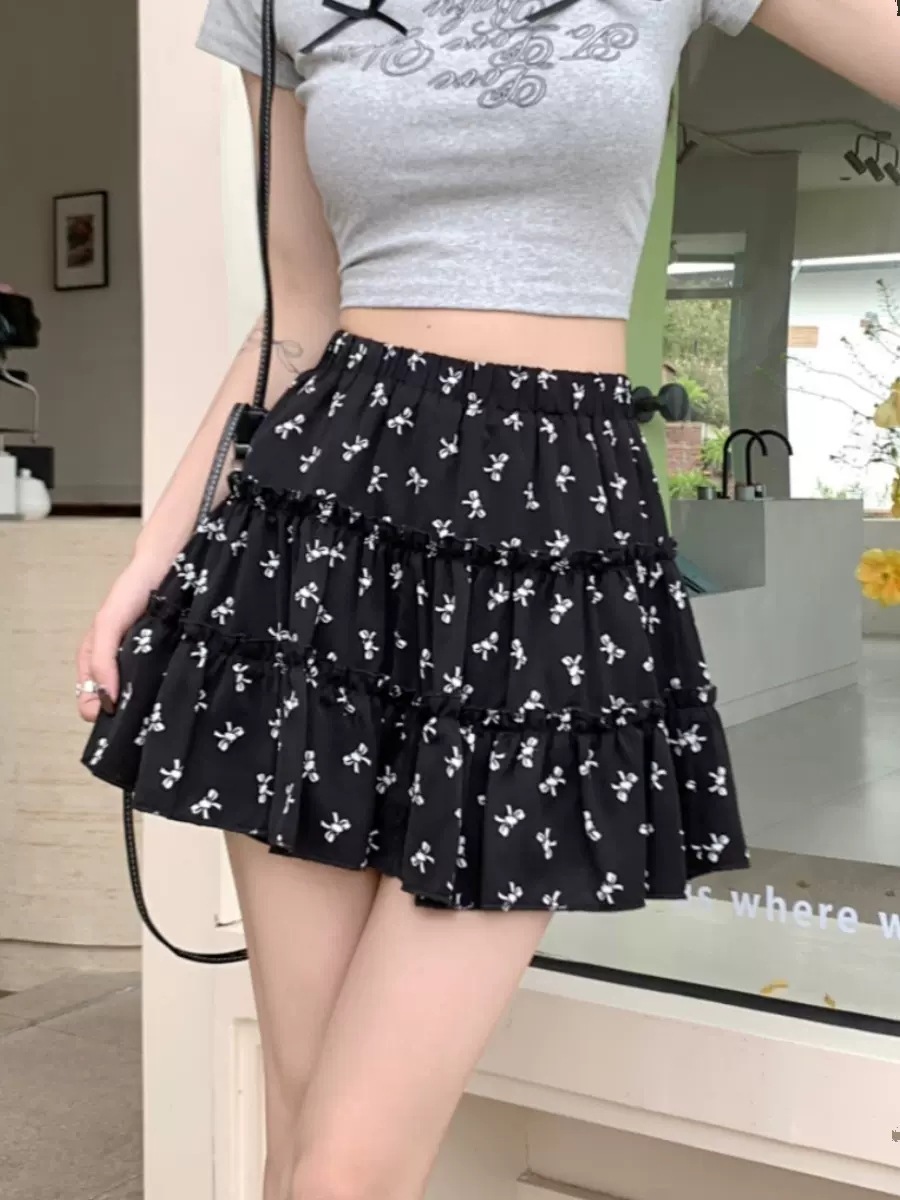 Rok Setengah Badan Bunga Pakaian Wanita Rok Kue Pinggang Tinggi Terlihat Langsing Wanita Gemuk Musim Panas Rok Pendek Lipit Bentuk Tubuh Buah Pir