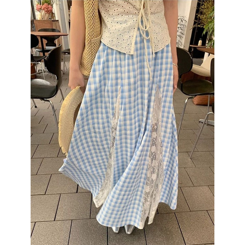 Rok Setengah Badan Pola Kotak Biru Jahitan Renda Gaya Santai Rok Huruf A Menutupi Daging Terlihat Kurus Pinggang Tinggi Wanita Gemuk Ukuran Besar