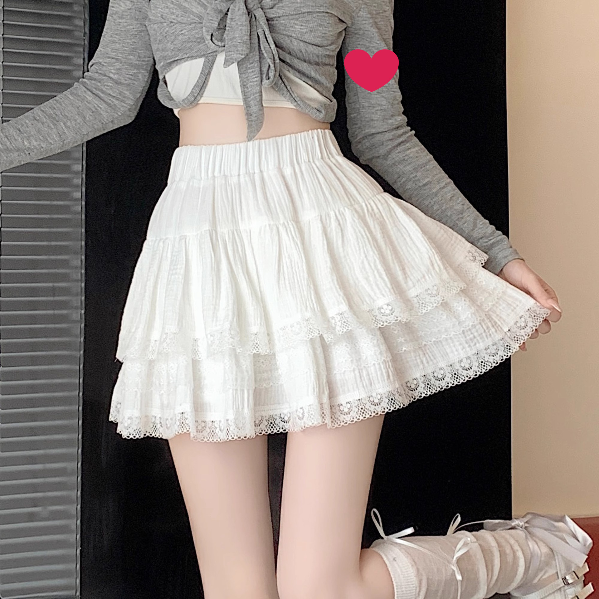 Rok Kue Balet Gaya Prancis Warna Putih Ukuran Besar Rok Pendek Pinggir Daun Teratai Musim Panas Rok Setengah Badan Renda A-Line Pinggang Tinggi