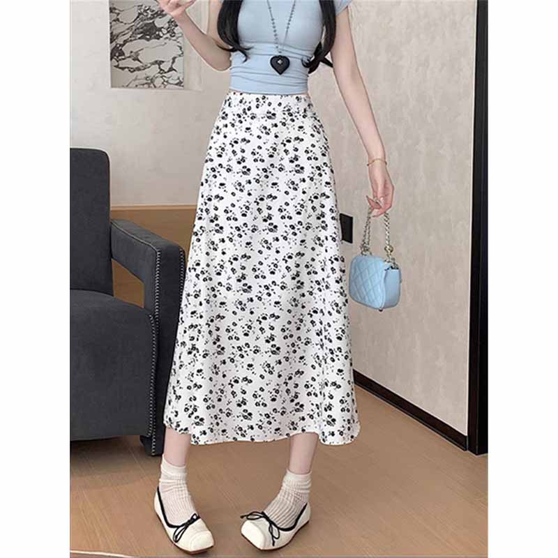 Rok Setengah Badan Bunga Warna Hitam Gaya Korea Ukuran Besar Rok Sifon Terlihat Langsing Model Panjang Sedang Musim Panas Wanita
