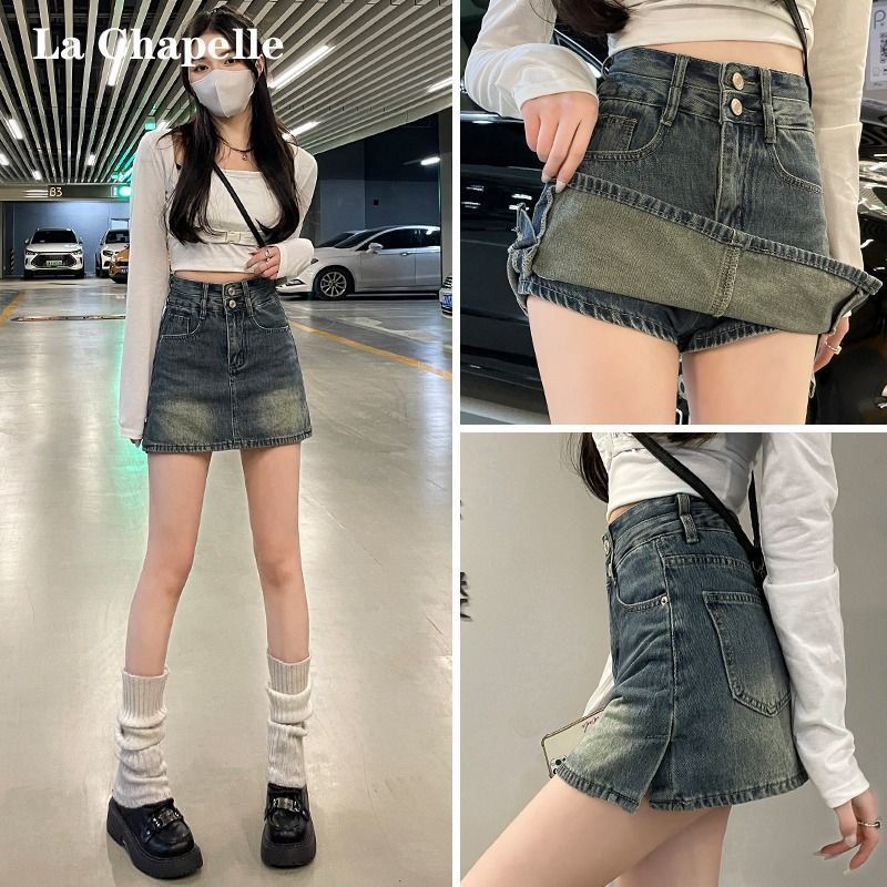 Rok Pendek Denim Bercabang Retro Rok Setengah Badan A-Line Menutupi Pinggul Bercahaya Terlihat Langsing Wanita Bertubuh Kecil Wanita Model Tipis Musim Panas