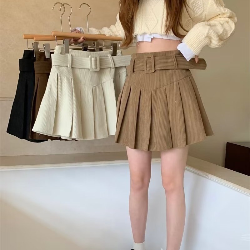 Rok lipit korduroi ukuran Plus, rok pendek kecil korduroi bergaya antik hitam pinggang tinggi untuk wanita