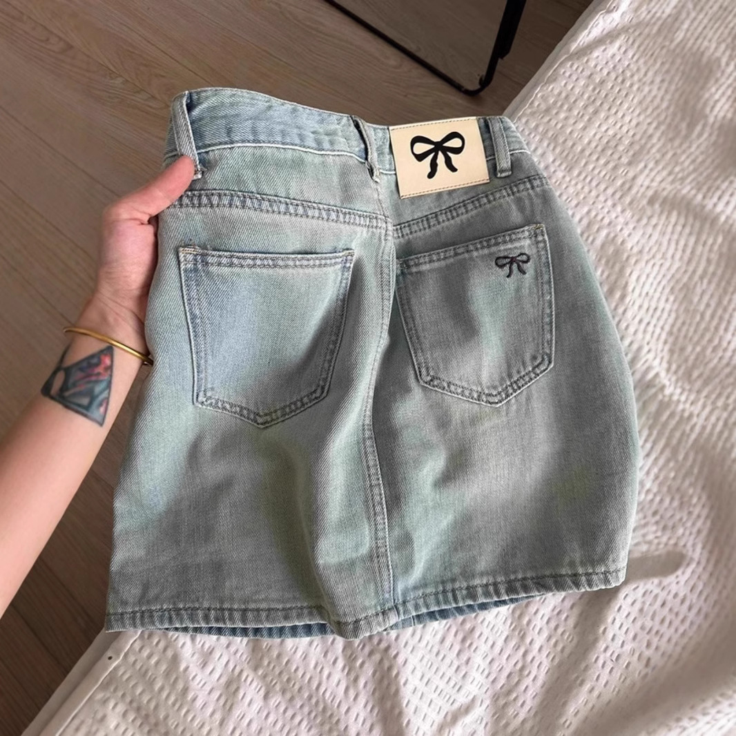 Rok Setengah Badan Denim Bordir Pita Kupu-Kupu Model Baru Musim Panas Rok A-Line Gadis Pedas Wanita Gemuk Ukuran Besar Rok Pendek Ketat Pinggul Terlihat Ramping