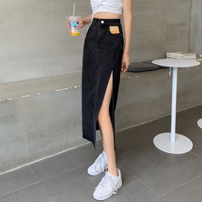 Rok denim wanita, rok pinggul perempuan ukuran besar, rok denim terbelah, musim panas, rasa, desain musim panas