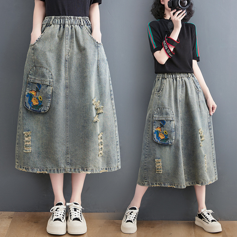 Barang Tersedia #2022 Musim Semi dan Musim Panas Model Baru Artistik Retro Ukuran Besar Denim Rok # Batas Harga