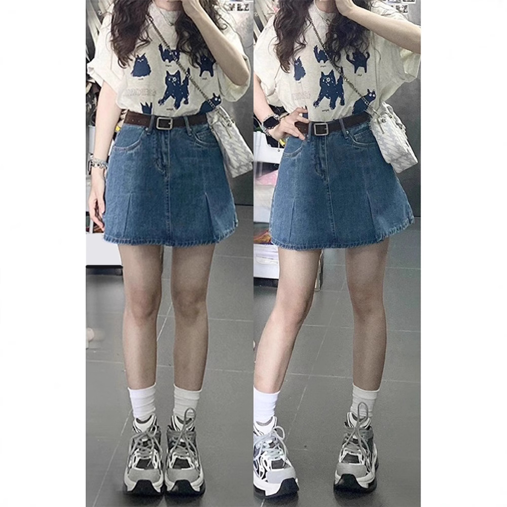 Rok Denim ins musim panas, rok a-line kasual serbaguna pelajar pinggang tinggi gaya Korea ukuran besar untuk wanita