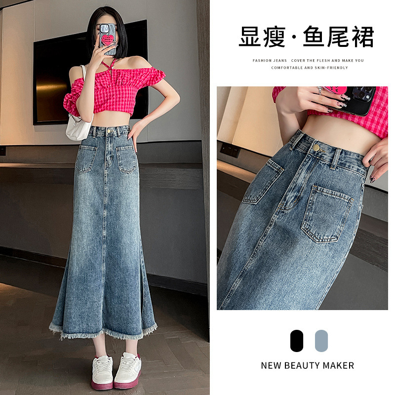 Rok panjang temperamen chic musim panas untuk wanita ukuran besar chubby anak perempuan bentuk pir figur Denim rok ekor ikan rok rasa desain