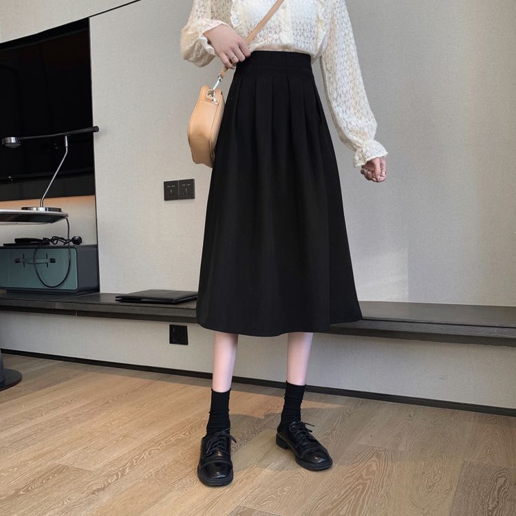 Rok Setengah Badan Wanita Ukuran Besar Pinggang Tinggi Terlihat Ramping Pinggang Tinggi Musim Gugur Rok Lipit Model Panjang Sedang A-line