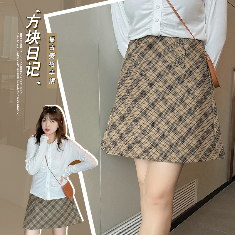 W662 Xuanchen chubby rok kotak-kotak wanita, bawahan ukuran besar musim semi retro kotak-kotak pinggang tinggi gaya Barat kotak-kotak modis