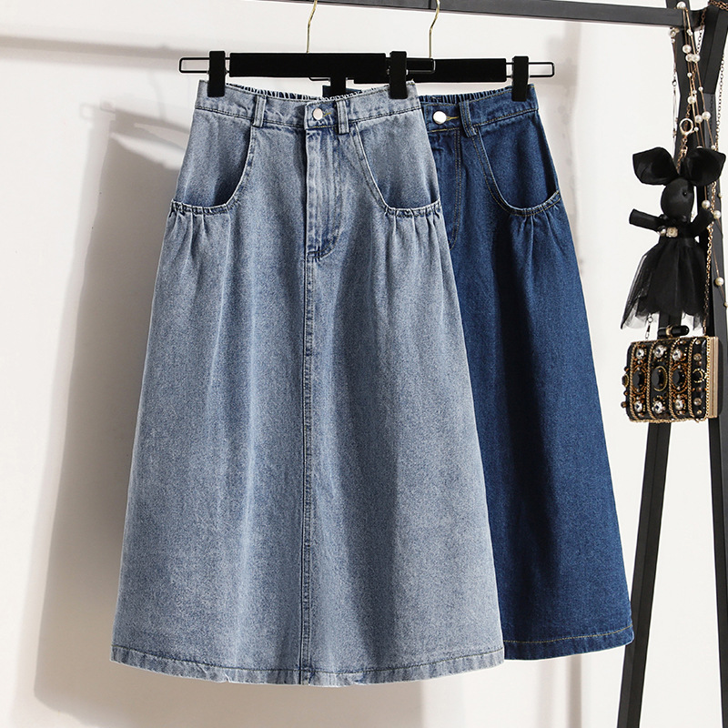 Rok Setengah Badan Denim Pinggang Tinggi Ukuran Besar Wanita Gemuk Model Baru Foto Solid Rok Panjang Sedang Kombinasi S-5XL200 Kg