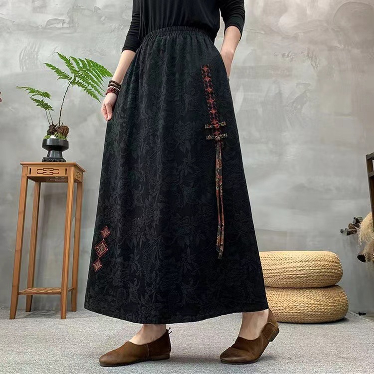 2023 rok jacquard linen dan katun bordir tugas berat gaya etnis baru musim gugur rok a-line panjang jahit telinga kayu