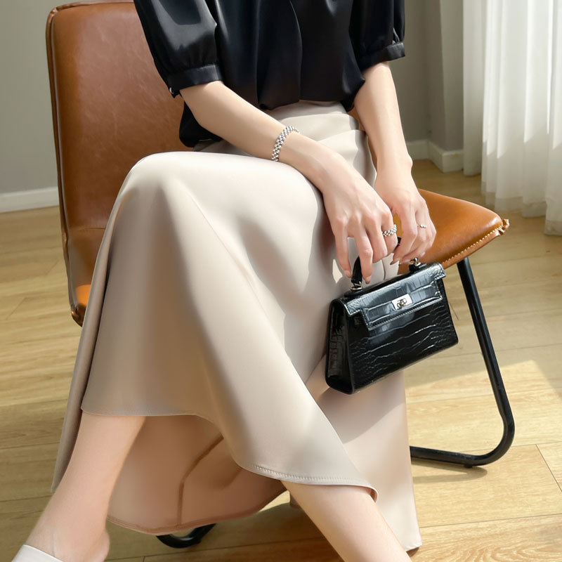 Rok wanita sutra buatan, rok a-line ramping musim panas wanita, Rok midi ketat, rok payung longgar satin
