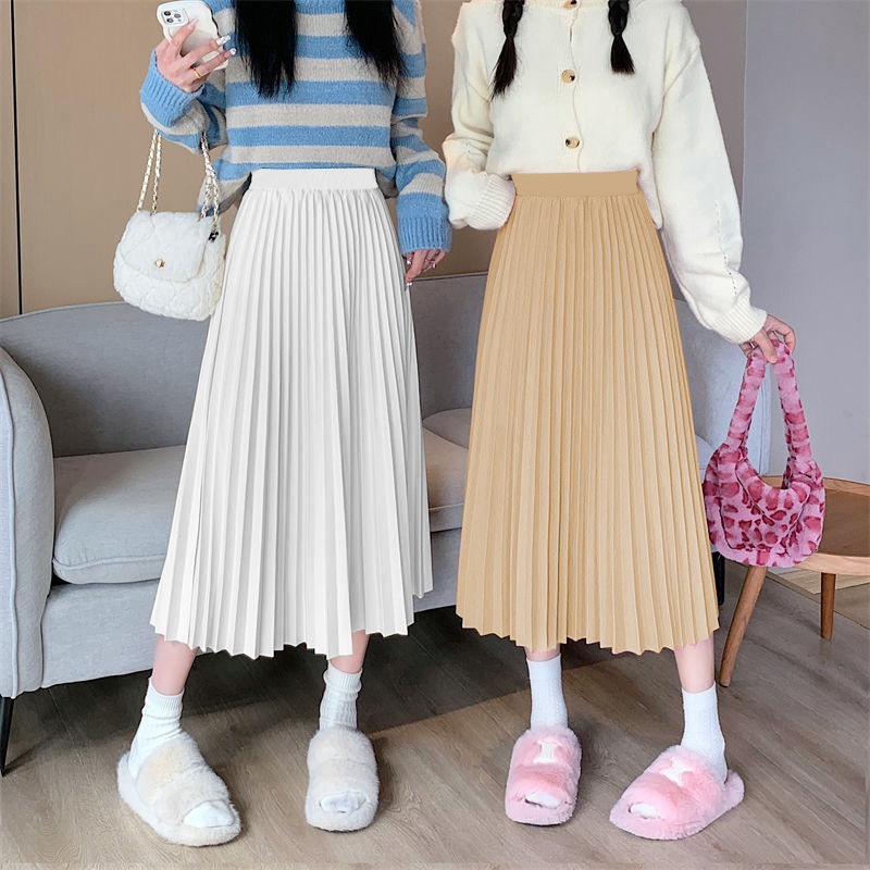 Rok lipit musim semi dan musim gugur lintas batas Amazon AliExpress, rok lipit warna solid berpinggang tinggi musim semi dan musim gugur terbaru dengan ujung rok lebar.