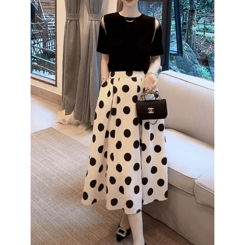 Rok Setengah Badan Pola-Dot Elegan Gaya Prancis Rok Panjang Sedang Ukuran Besar Gaya Terkurung Terlihat Langsing Musim Panas Rok Payung Model Besar Model Pinggang Tinggi