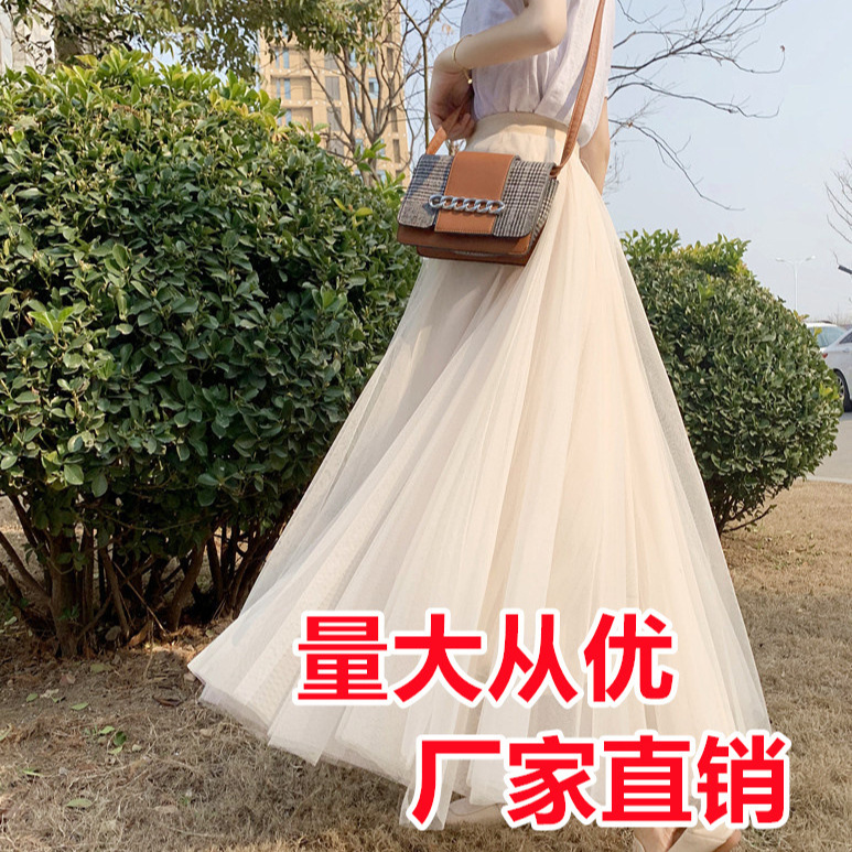 Rok a-line pinggang tinggi ukuran besar, rok kasa berlipat peri musim panas dan semi, rok jala ukuran besar, rok a-line pinggang tinggi, musim panas dan musim semi