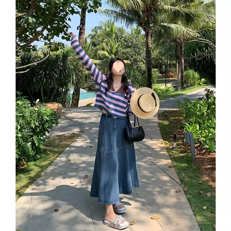 Rok Panjang Ekor Ikan Model Panjang Model Setengah Panjang Musim Semi Wanita Rok Denim Menutupi Pinggang Tinggi Warna Biru Ukuran Besar