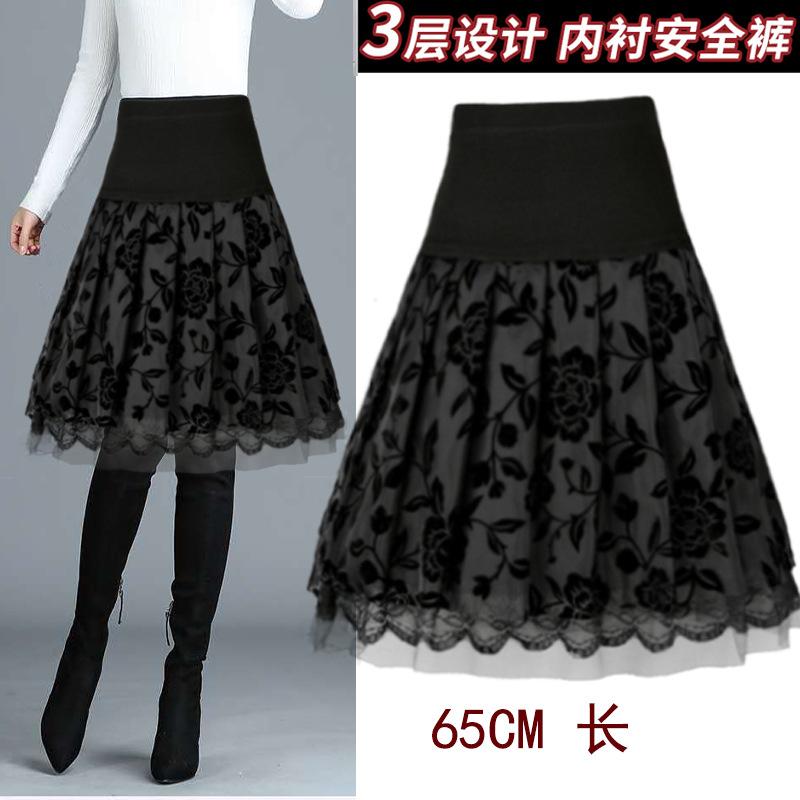 Rok panjang setengah elastis pinggang tinggi, rok pelangsing lurus lubang tebal ukuran plus musim gugur dan musim dingin 63160