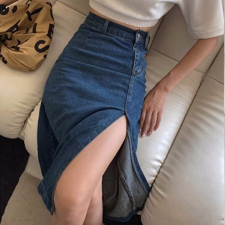 Rok Denim terpisah untuk wanita 2024 rok midi model a-line gadis gemuk penutup pinggang tinggi musim panas baru ukuran plus