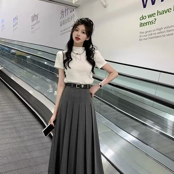Rok wanita setelan abu-abu ukuran plus, rok panjang anak perempuan gemuk pinggang tinggi, Rok lipit a-line musim panas ukuran plus