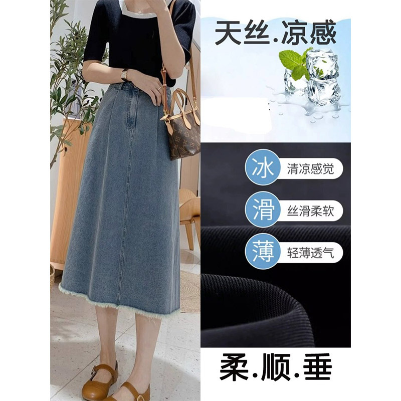 Rok Denim Ukuran Besar Rok Setengah Badan Pinggang Elastis Rok A-Line Musim Panas 2025 Rok Wanita Gemuk Terlihat Langsing Rok Panjang Sedang Pinggang Tinggi 966