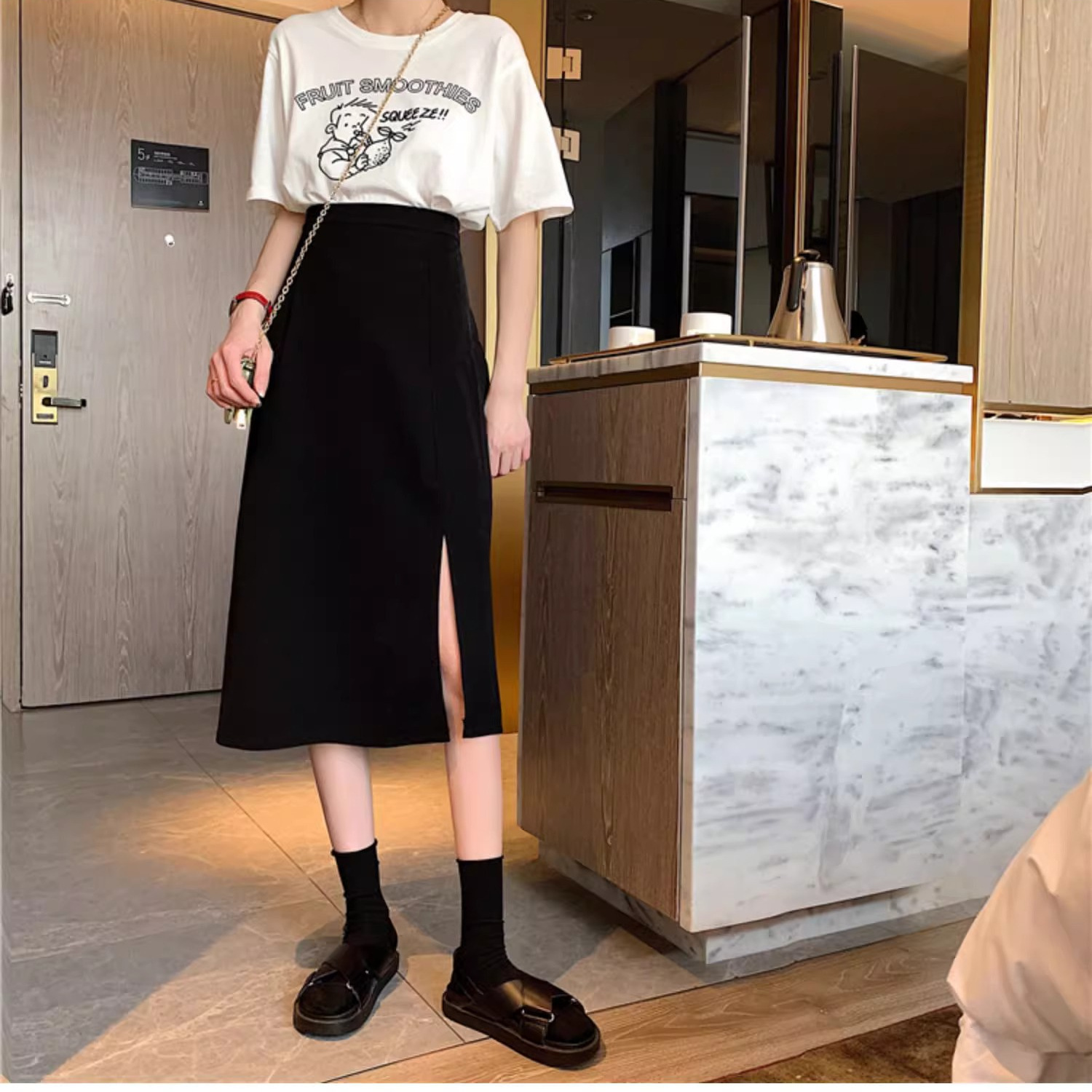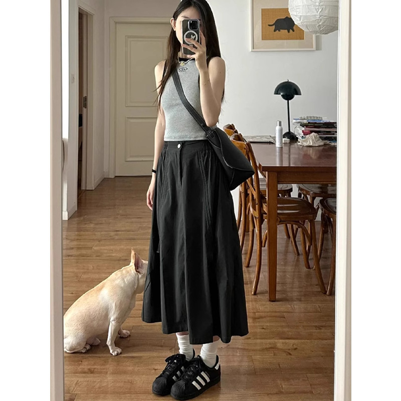Rok Setengah Badan Warna Hitam Rok Panjang Musim Panas A-Line Pinggang Tinggi Tubuh Kecil Model Tipis MM2025 Ukuran Besar Sedang Panjang Perut
