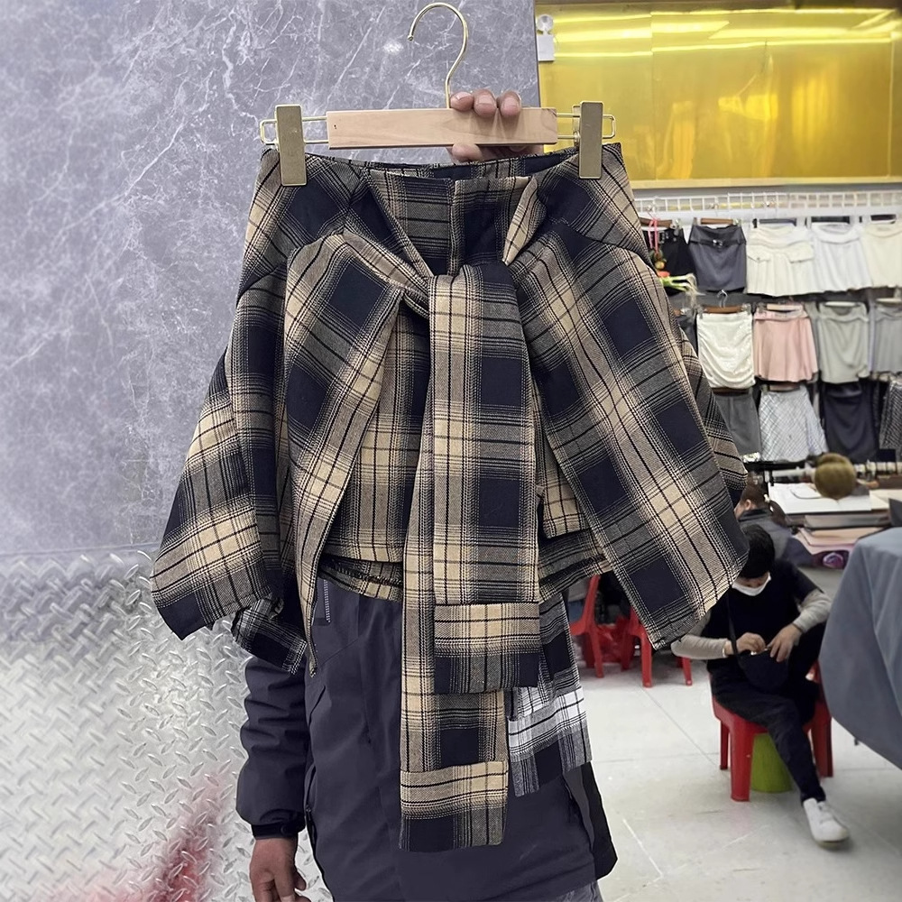 Rok Pendek Kotak-kotak Palsu Dua Potong Gaya Desain Tidak Teratur Rok Setengah Badan Retro Gaya Hong Kong Model Musim Semi 2025 Wanita