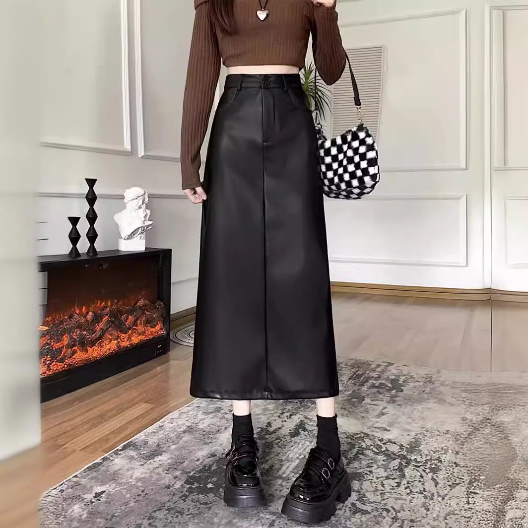 Rok kulit PU Retro untuk wanita, 2024 ukuran besar gadis gemuk pinggang tinggi pelangsing kasual belahan a-line rok kulit selubung