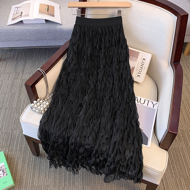 Rok Setengah Badan Lipit Warna Hitam Gaya Elegan Rok Benang A-Line Besar Model Panjang Sedang Terlihat Langsing Pinggang Tinggi Model Baru Musim Panas 2025 Wanita
